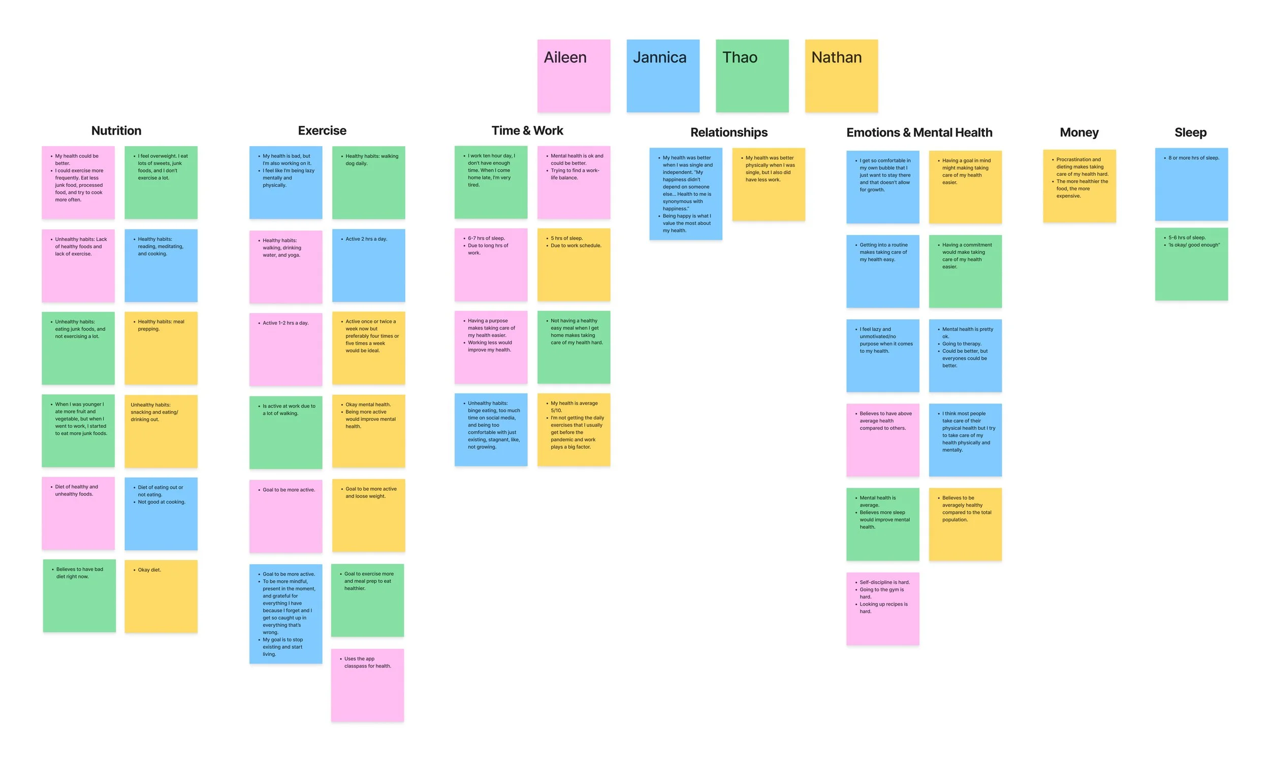 After conducting interviews, it was time to make sense of it all. I began synthesizing data by grouping notes and post-its that have similar content. I looked for patterns and labeled those groups.
