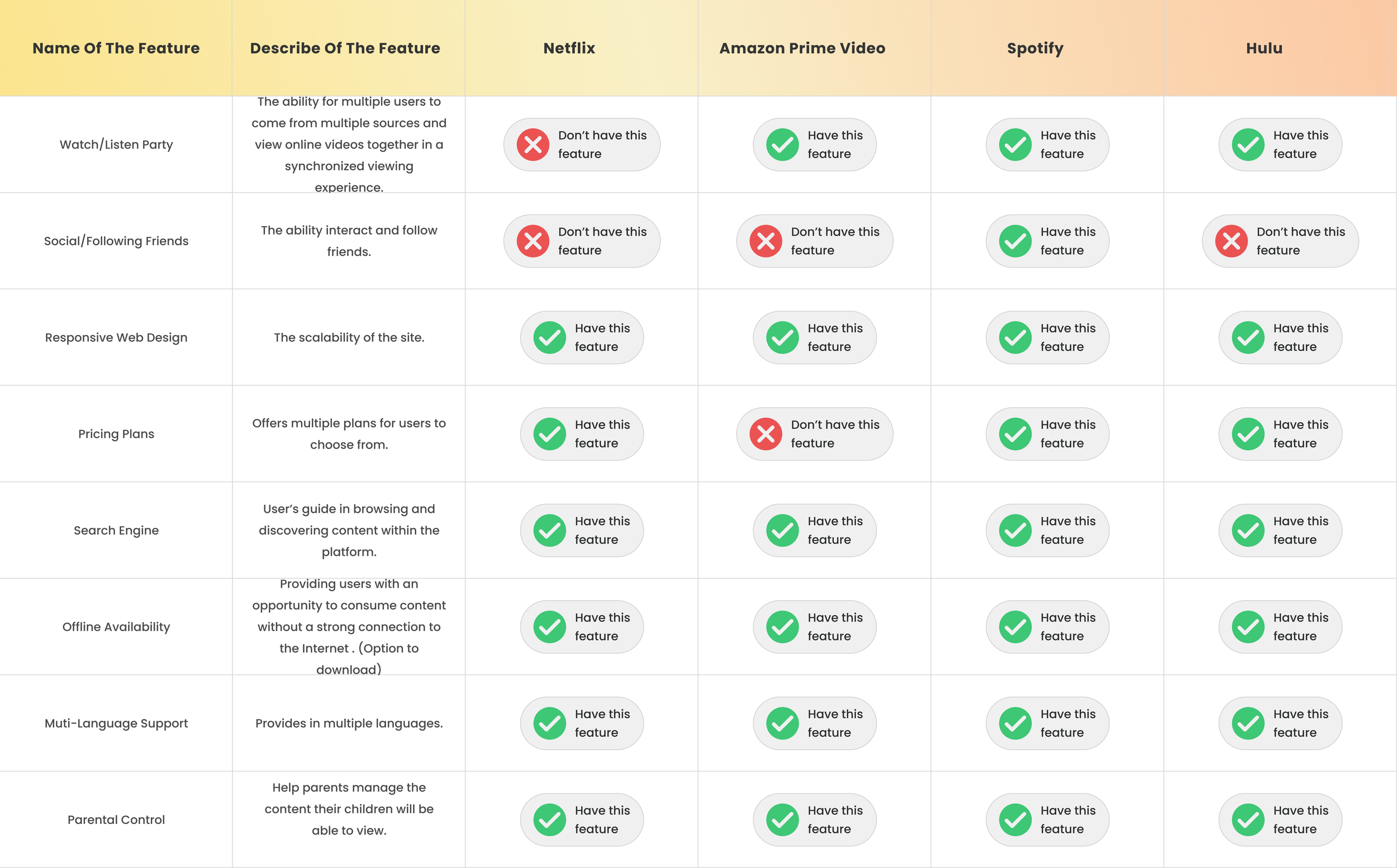 I first did a competitor feature analysis research to get a better understanding of the topic. Then I continued my research by conducting interviews. Some questions I asked were “What feature do you wish Netflix had? And why?” And “What are your likes and dislikes about Netflix?” I synthesized my research with an affinity map where I learned about different users and their desires.